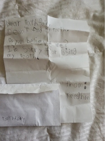 Today, as I was digging through a bag of old craft projects, I found this letter. Needless to say, it was bittersweet. I couldn't tell you how old Keeghan was when he wrote it, or how his tooth came out without him having anything to leave as proof for the Tooth Fairy. But there is so much of his personality in this...for a moment, it was like he was still here.